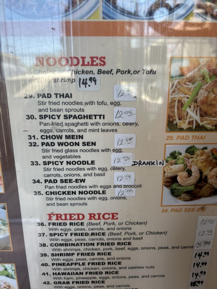 Stir fried noodles. Bean sprout with beef, chicken, pork, tofu with egg, or without egg.
